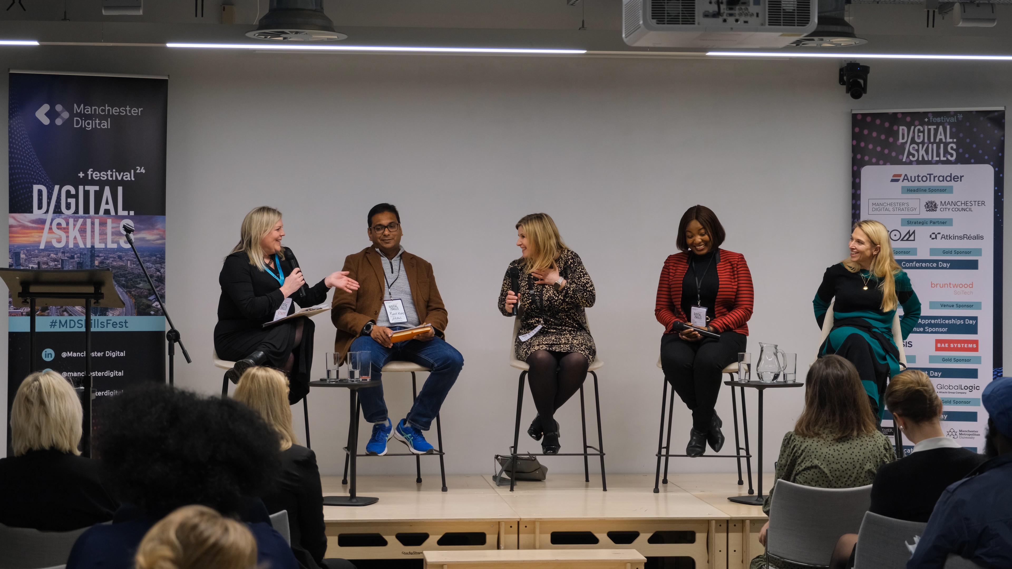 Our Question Time panel was hosted by Katie Gallagher and brought together Rakesh Maharaj, Co-founder and CEO at ARMA Academy; Dr Opeoluwa Aiyenitaju, Lecturer in Business Information Systems at MMU; Rebekah Drury, Senior People Business Partner at Booking.com and Alison Ross, Chief People and Operations Director at Auto Trader.