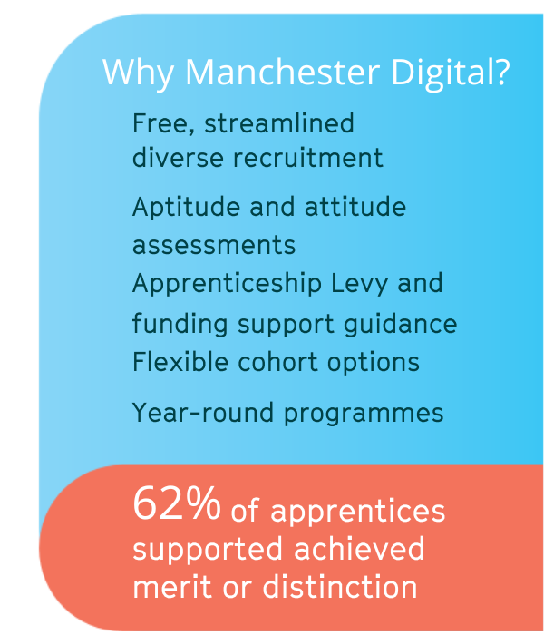 Manchester Digital understands the skills and job roles in demand by employers across Greater Manchester, now and in the future, which is why we have developed a suite of Level 4 digital apprenticeship pathways offered via our award winning digital apprenticeship academy.