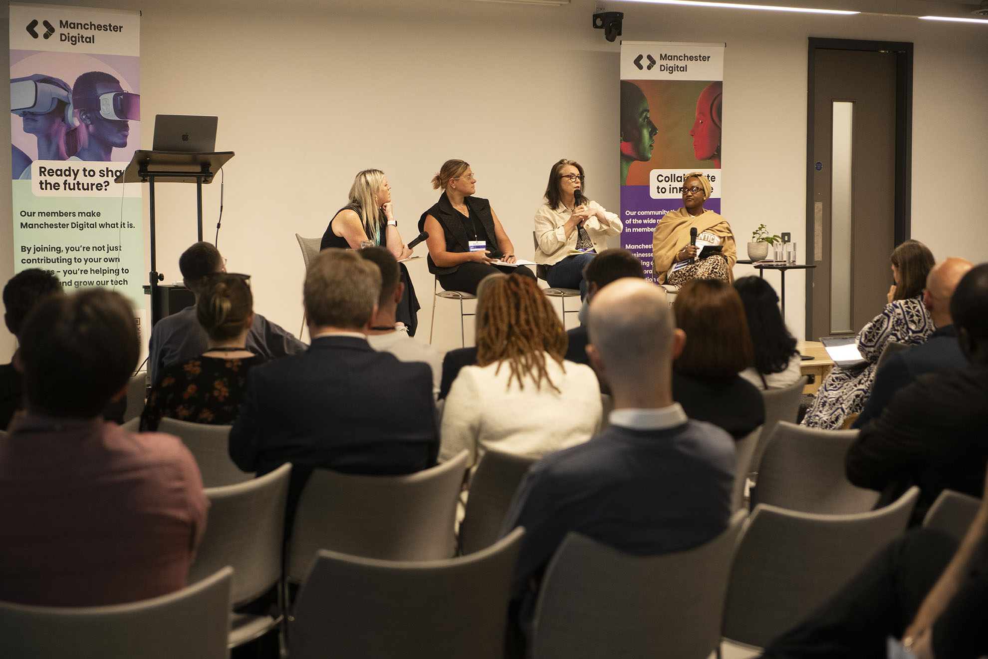 L-R: Katie Gallagher OBE (Manchester Digital), Wendy Saunders (Lewis Silkin), Elaine Mullan (Corlytics), Dr. Nafisa Usman (University of Salford)Blockchain, Crypto and the Future of Decentralised Finance (DeFi)