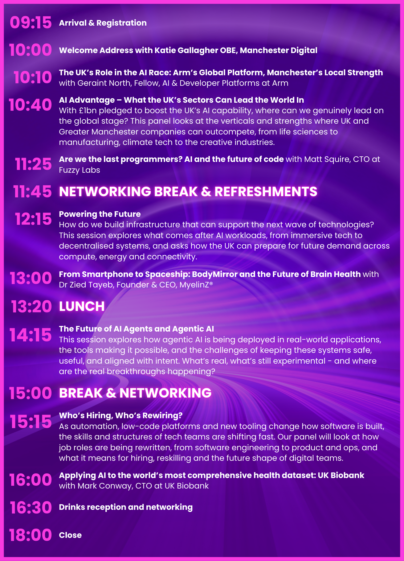 MD Future Live is Manchester Digital’s one-day conference on emerging tech. A fast-paced programme of talks and panels with keynotes from global brands and the region’s most exciting startups, covering AI, the infrastructure that powers it, quantum readiness and the skills to make it work.